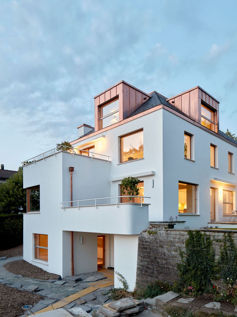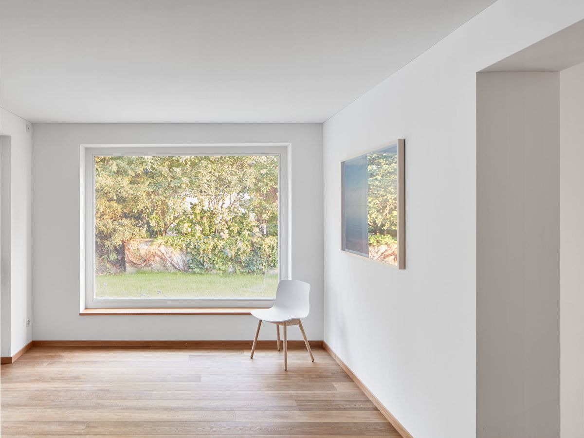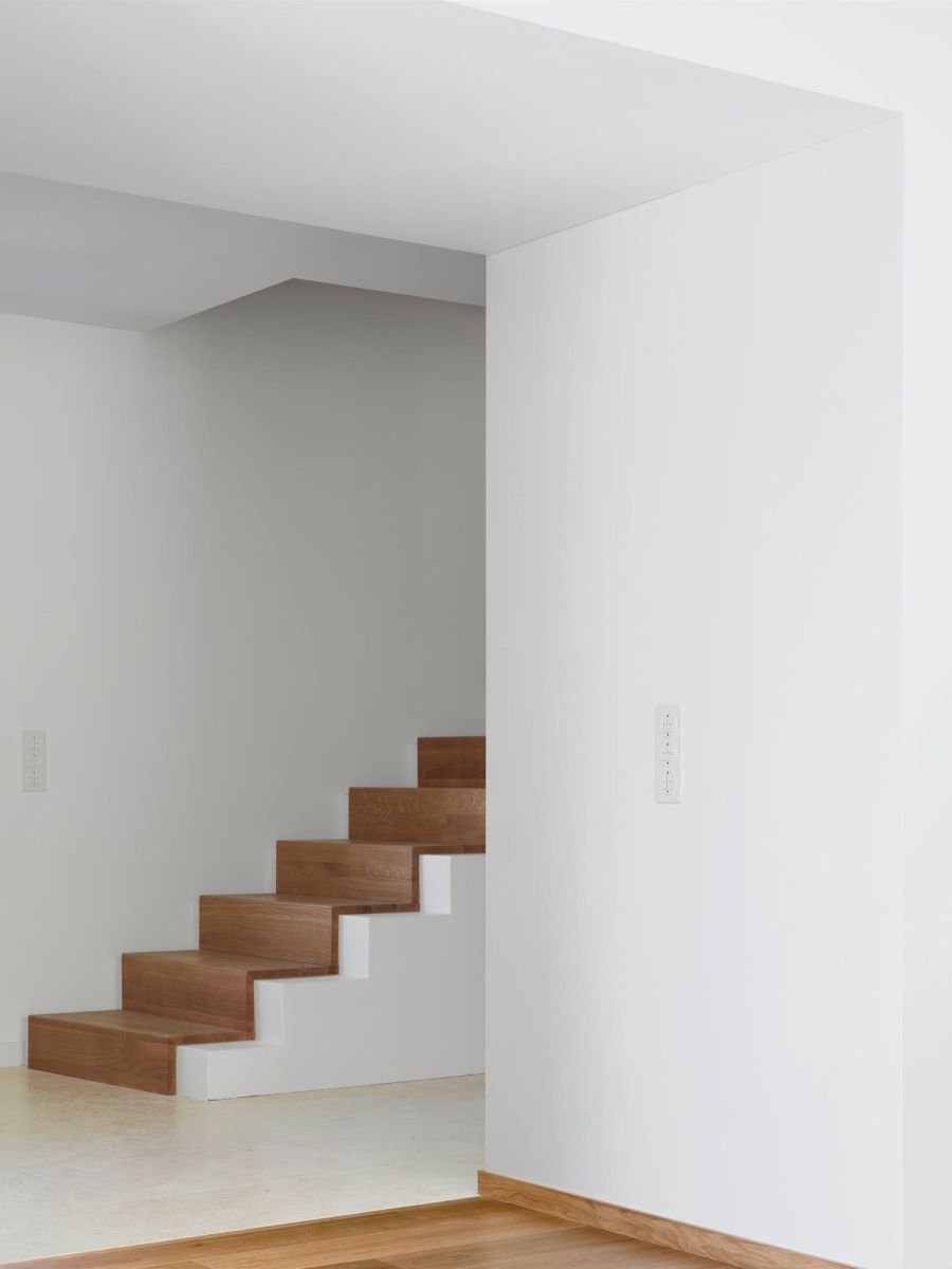 BHSF Architekten haben das Gebäude von seiner unentschlossenen, zwischen Landistil und klassischer Moderne changierenden Ornamentik befreit und den Grundrisszuschnitt an die Bedürfnisse der jungen Familie der Bauherrschaft angepasst, so dass letztlich nur die bauliche Substanz des Rohbaues erhalten geblieben ist.