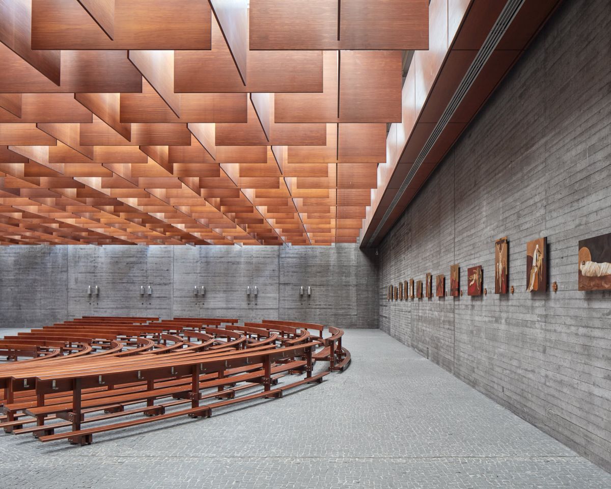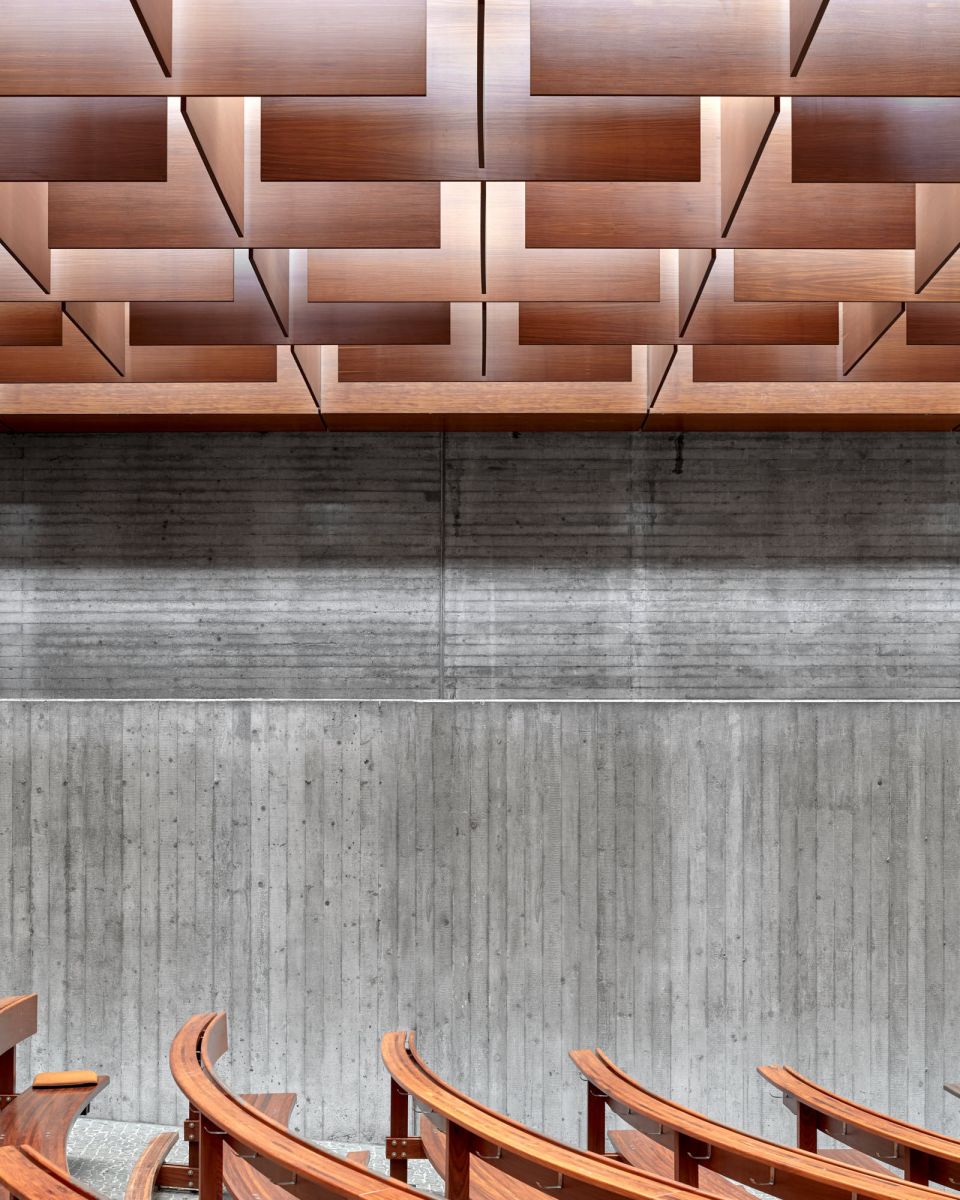 Die Wände des Kirchenraums bestehen aus Sichtbeton, der zum Altar leicht abfallende Boden ist in Kleinpflaster ausgeführt. Einen organischen Kontrast bildet dazu das hölzerne Mobiliar und die mit senkrechten Holztafeln abgehängte Decke. Die Holztafeln sind dabei so angeordnet, dass der Kirchenraum unabhängig von der Tageszeit gleichmäßig und blendfrei ausgeleuchtet ist.
