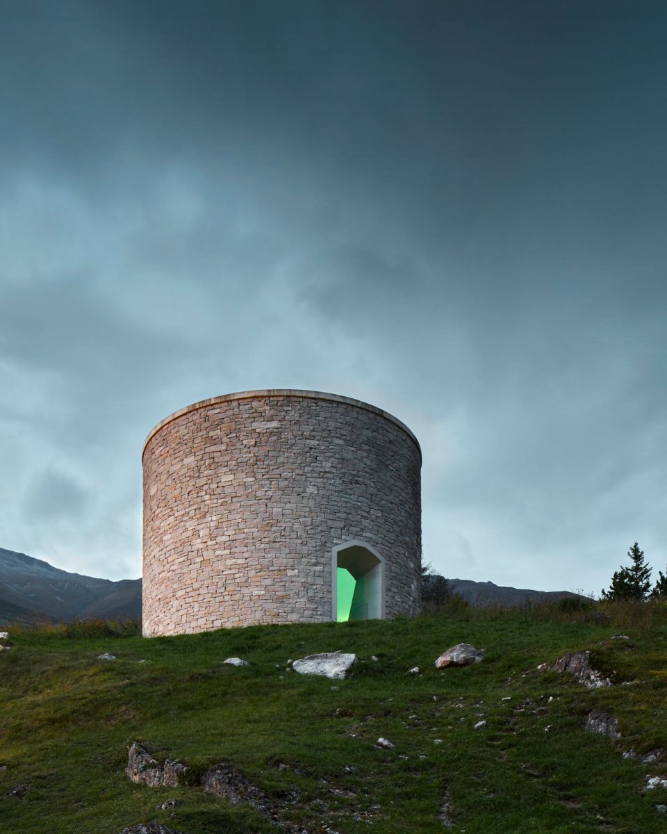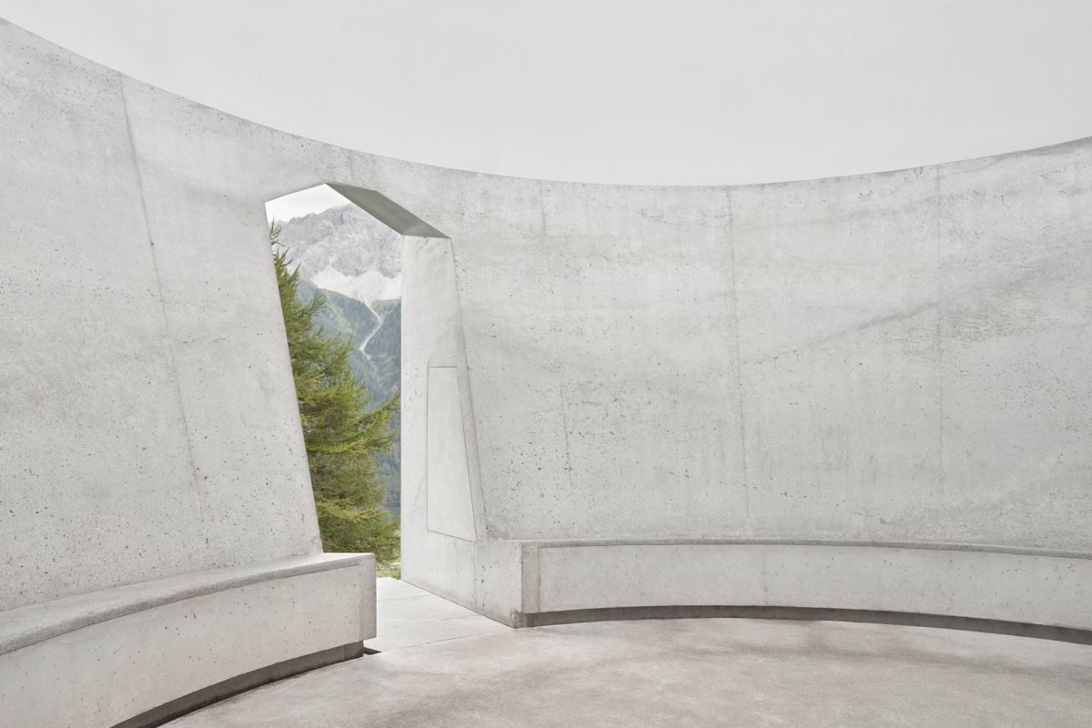 Der Skyspace Piz Uter entstand in enger Zusammenarbeit mit dem Schweizer Architekturbüro Offermann Architektur & Projekte. Die Achse der Eingangsöffnung, der einzige sich horizontal öffnende Blick, ist am Piz Uter ausgerichtet, ebenso wie die Linie des Sturzes dem Gipfelgrat zu folgen scheint.