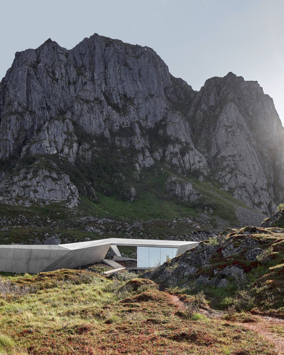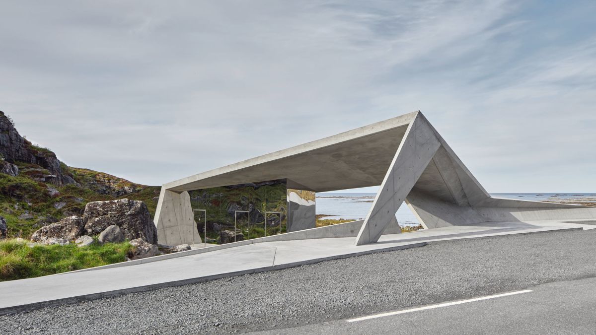 Entlang der Landschaftsroute Andøya hat das Osloer Architekturbüro MORFEUS an diesem historischen Ort einen Rastplatz geschaffen, dessen polygonale Sichtbetonstruktur einen artifiziellen Kontrast zur umgebenden Landschaft bildet, und dennoch gleichesam beruhigend mit der Topografie verschmilzt.
