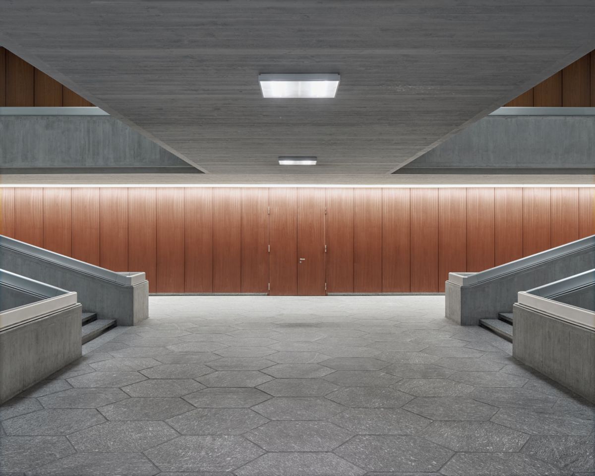 Der Eingangsbereich wird dominiert von den ausladenden Treppenaufgängen, über welche die Hörsäle im Obergeschoss erschlossen werden. Der futuristische Charakter der äußeren Gestalt setzt sich hier fort und wird neben den Freitreppen dominiert von einer türkis getünchten, sich über drei Stockwerke erstreckenden Betonwand.