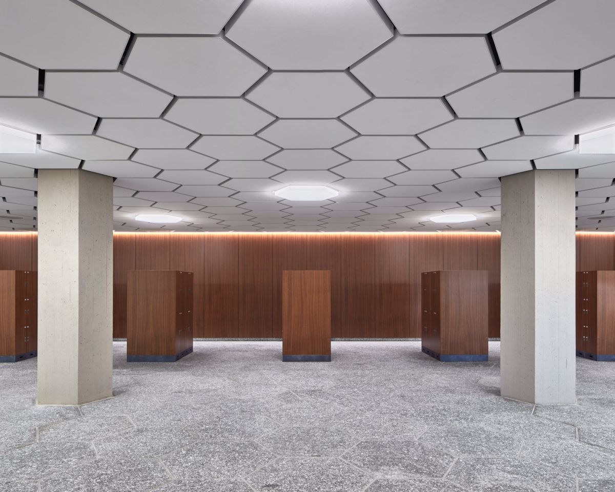 Einem futuristischen Ufo gleichend, scheint der Baukörper über dem Boden zu schweben, dessen sechseckige Form wird in den gestaltenden Elementen des Innenraums wieder aufgegriffen wird.